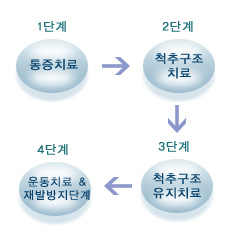그림과 같은 4단계와 함께 척추 질환(디스크, 퇴행성척추증, 척추분리증, 척추전방전위증, 측만증등)을 비수술적인 요법인 바이오메카닉 교정치료와 운동요법으로 치료한다.